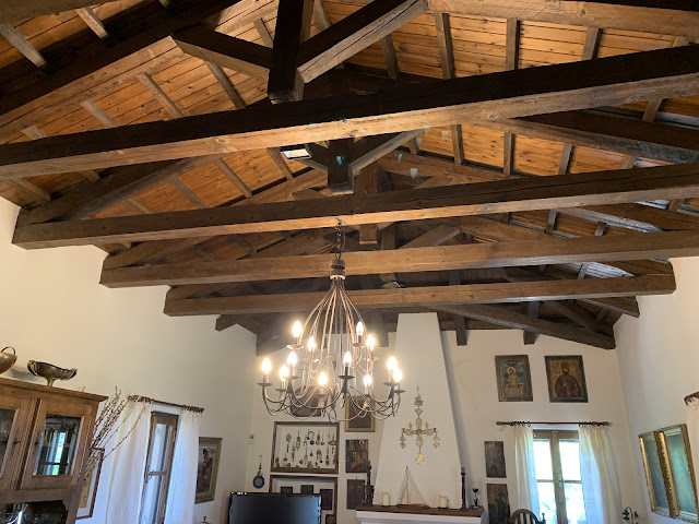 There is a huge living room with fire place and a wood burning stove. The ceiling is covered with solid wood beams.
